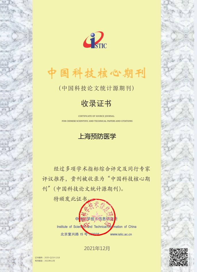 在大家的共同努力下,《上海预防医学》杂志学术影响力持续提升,继被WHO西太平洋医学索引(WPRIM)、日本科学技术振兴机构数据库(JST)、美国邬利希期刊指南网络版(Ulrich's WEB)及化学文摘(CA)收录后,2021年12月27日,科技部中国科学技术信息研究所公布了《2021年版中国科技期刊引证报告(核心版)》杂志名单,《上海预防医学》首次被收录为“中国科技核心期刊”(中国科技论文统计源期刊,CSTPCD)。诚挚感谢关注与支持《上海预防医学》发展的广大专家、学者、作者及读者,我们将进一步提高办刊水平与出版质量,争取更大成绩!
